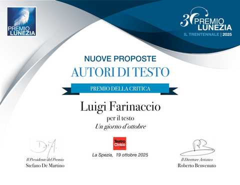 Luigi Farinaccio nell’ambito dell’incontro-dibattito “La sicurezza sismica delle scuole italiane” presenterà il brano “Un giorno d’ottobre” vincitore del “Premio della Critica” alla XXX° edizione del Concorso Nazionale “Premio Lunezia” 2025 sezione Autori di Testo, svoltosi lo scorso 19 ottobre al Teatro Civico di La Spezia.