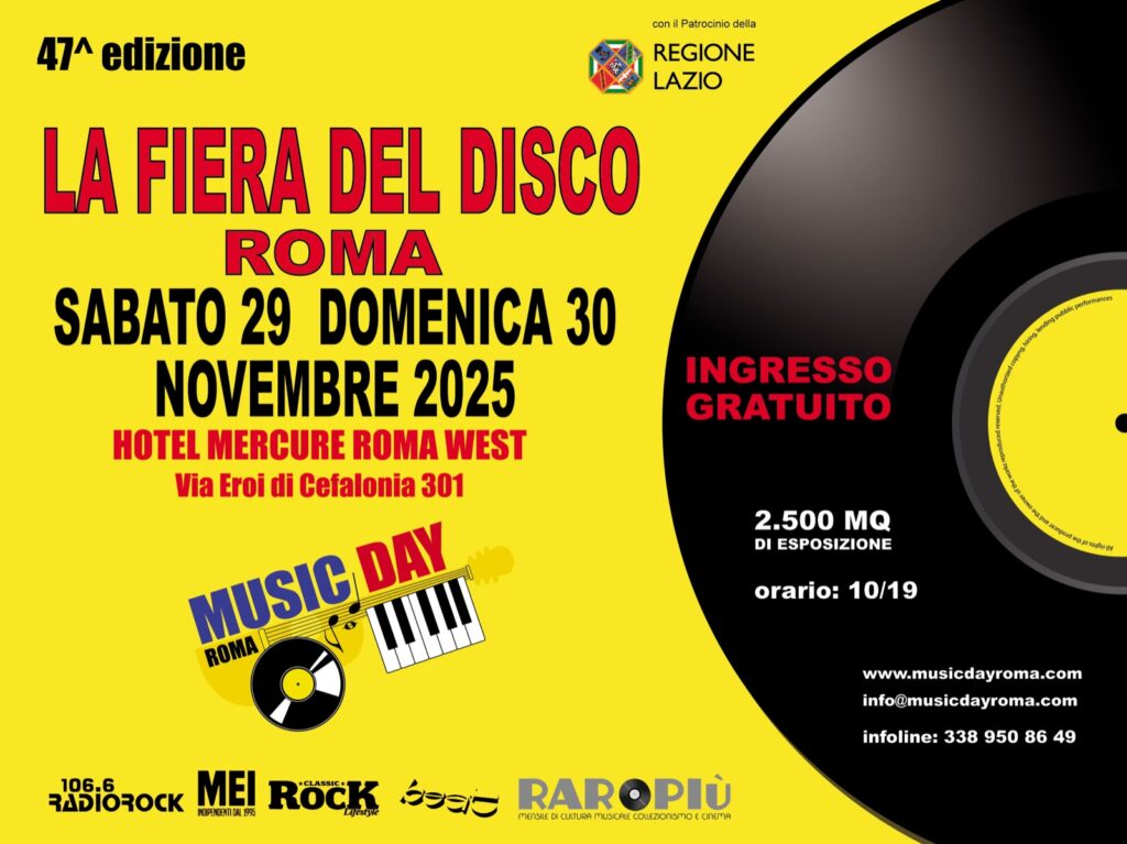 Eccola qui, la seconda edizione autunnale del Music Day Roma, l’attesissima Fiera del Disco della Capitale, come sempre ricca di eventi e protagonisti di primo piano, oltre che di migliaia di occasioni d’acquisto fra dischi in vinile, cd, dvd, gadget, oggettistica e memorabilia musicale. I 2.500 mq della fiera ospitano più di 60 espositori da tutta Italia, professionisti esperti e conoscitori del mercato in grado di consigliare ogni acquirente e aiutarlo a districarsi fra le innumerevoli offerte. Come sempre ce n’è per tutte le tasche ed esigenze, da quelle degli amatori a quelle dei collezionisti più accaniti in cerca di rarità Come sempre accanto all’area espositiva troveranno spazio presentazioni, firmacopie e incontri con artisti, autori e addetti ai lavori.  Al Music Day Roma accanto alla musica, ci sono anche cinema, letteratura, scambi culturali, che arricchiscono ciascuno in un’atmosfera di condivisione e passioni comuni. Nel corso dei due giorni di fiera sarà possibile incontrare ospiti come Ghigo Renzulli, Le Orme, Guido e Maurizio De Angelis, Enzo G Castellari, etc. Da non perdere poi per tutti gli amanti di Lucio Fulci e del suo cinema, la presentazione di un libro di fotografie inedite dal set di “Non si sevizia un Paperino”.