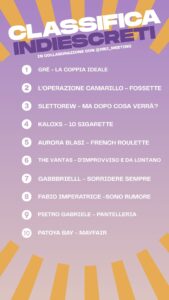 Ogni settimana i migliori brani – valutati dal nostro Panel Artistico, dalla redazione del format Indiescreti e scelti attraverso il coinvolgimento attivo degli utenti – saranno inseriti nella programmazione e nelle attività promozionali di Indieffusione.