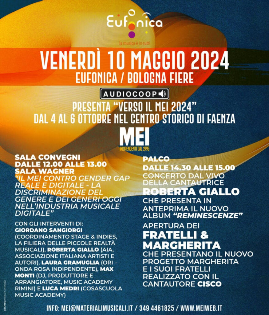IL MEI DI FAENZA PARTECIPA VENERDI 10 MAGGIO A EUFONICA, LA GRANDE FIERA DELLA GRANDE MUSICA A BOLOGNA: ECCO IL PROGRAMMA DEL 10 MAGGIO A BOLOGNA DEL MEI CON UN CONVEGNO SUL GENDER GAP E UNO SUL LISCIO E CON LA PRESENTAZIONE DELLA NUOVA ORCHESTRA SANTA BALERA, DEL NUOVO ALBUM DELLA CANTAUTRICE ROBERTA GIALLO E DEL NUOVO SINGOLO DEI FRATELLI & MARGHERITA.