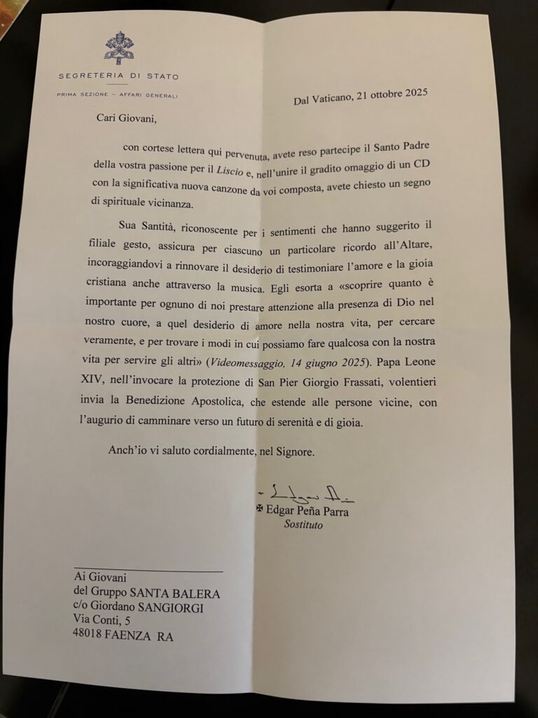 Papa Leone XIV ha inviato una lettera di ringraziamento e benedizione ai Santa Balera per l’invio del brano “Terra amata, terra mia” insieme al primo CD del gruppo. Il brano, presentato a maggio a San Petronio e in estate su Radio Vaticana, è un inno alla pace che invoca il Padre Nostro contro tutte le guerre e ha ottenuto un grande successo di pubblico e critica.