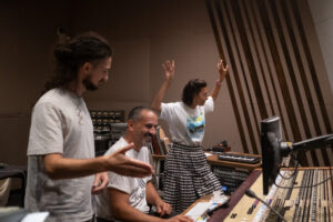 al Duna studio con Andrea Scardovi e Francesco Cinque. Primo ascolto del mixaggio di Muy Poca Tierra. Foto di Viola Macrelli